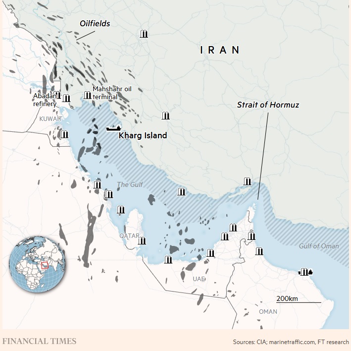Σύμφωνα με τους Financial Times, περίπου 21 εκατομμύρια βαρέλια πετρελαίου από την παραγωγή του Ιράν, του Ιράκ, του Κουβέιτ, της Σαουδικής Αραβίας και των Ηνωμένα Αραβικά Εμιράτα, διέρχονται καθημερινά από το στενό, που διαχωρίζει το Ιράν από τα αραβικά κράτη του Κόλπου, αντιπροσωπεύοντας περίπου το 1/3 των θαλάσσιων εξαγωγών πετρελαίου παγκοσμίως.