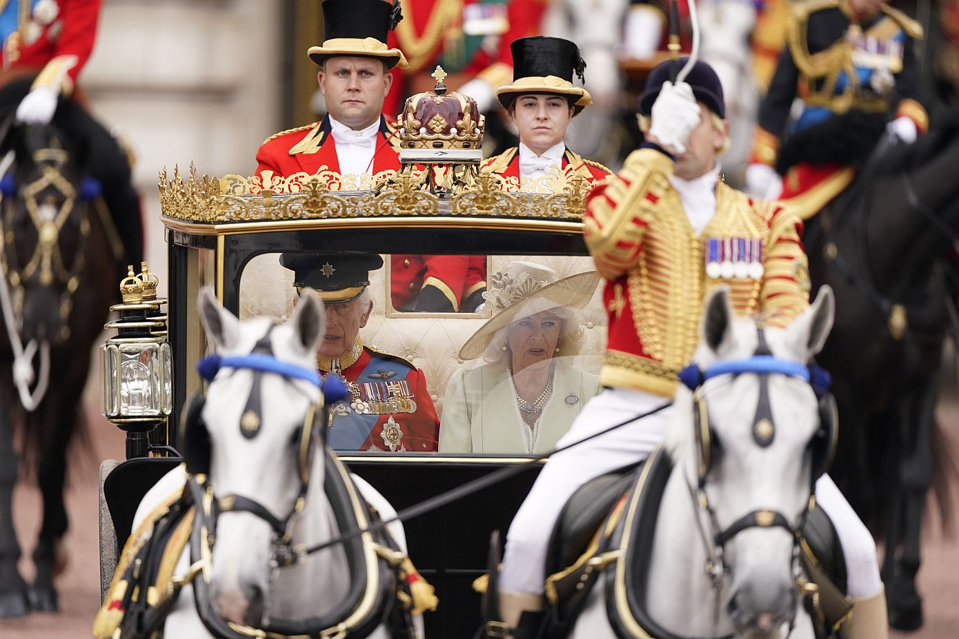 Έχοντας στο πλευρό του την βασίλισσα Καμίλα, ο Κάρολος ανεβαίνει στην άμαξα και σε άλλη άμαξα, ο πρίγκιπας Ουίλιαμ και η Κέιτ, με τα τρία παιδιά τους, τον Τζορτζ, την Σάρλοτ και τον Λούις.