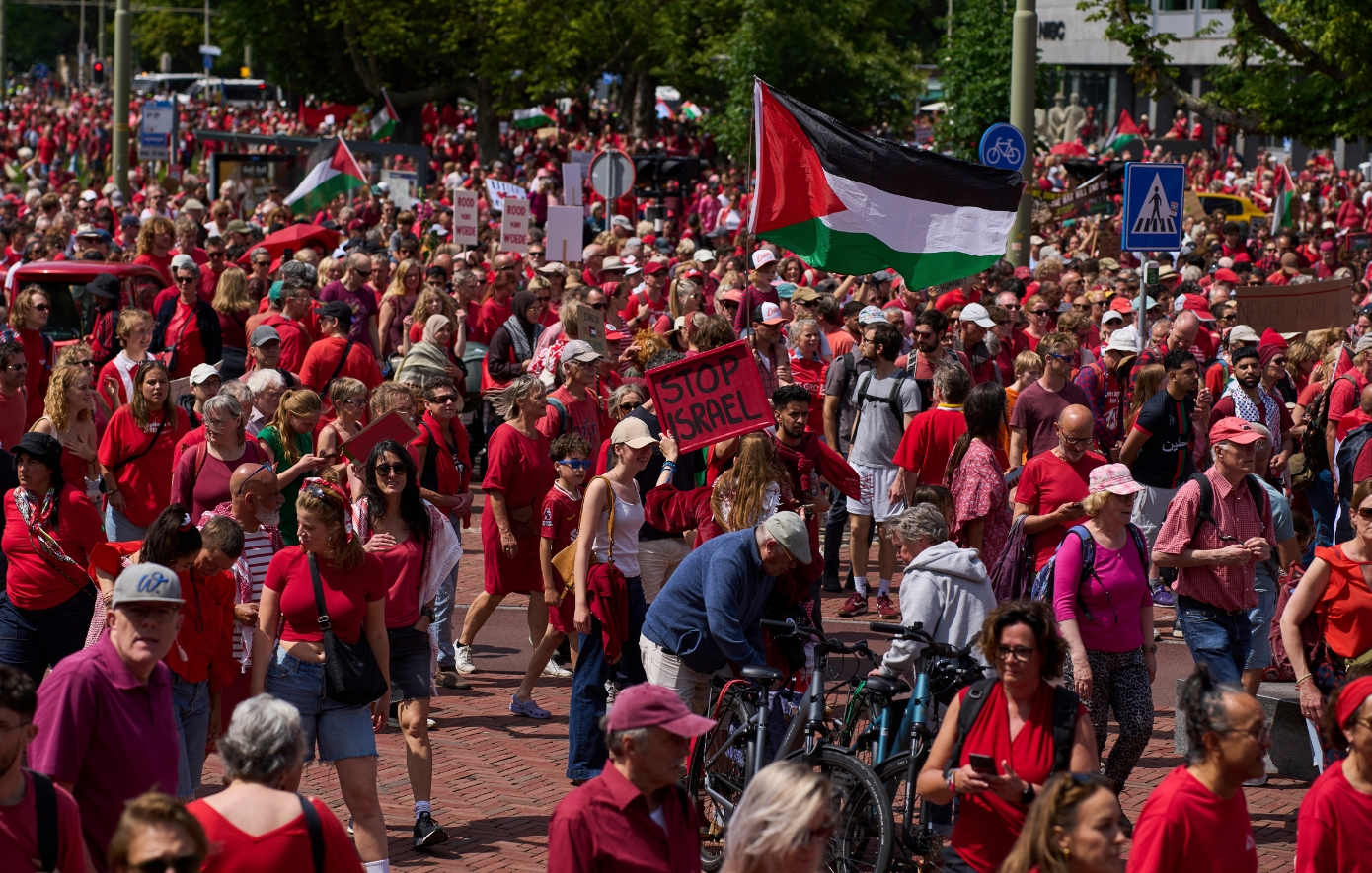 Ντυμένοι στα κόκκινα, δεκάδες χιλιάδες διαδηλωτές, συμπεριλαμβανομένων οικογενειών με παιδιά, κατέβηκαν σε δρόμους στη Χάγη σήμερα για να εκφράσουν τη διαμαρτυρία τους κατά την πολιορκία της Λωρίδας της Γάζας από το Ισραήλ, απαιτώντας από την ολλανδική κυβέρνηση να λάβει περισσότερα μέτρα κατά αυτού που οι διαδηλωτές αποκάλεσαν «γενοκτονία» στη Γάζα.