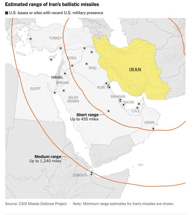 Αρκετές αμερικανικές βάσεις, καθώς και άλλες τοποθεσίες όπου υπάρχει αμερικανική στρατιωτική παρουσία, εκτιμάται ότι βρίσκονται εντός της εμβέλειας των βαλλιστικών πυραύλων του Ιράν.