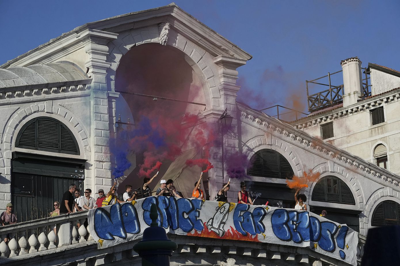 Οι διαδηλωτές ύψωσαν ένα μεγάλο πανό και άναψαν καπνογόνα πάνω στην περίφημη γέφυρα του Ριάλτο, στο Μεγάλο Κανάλι.