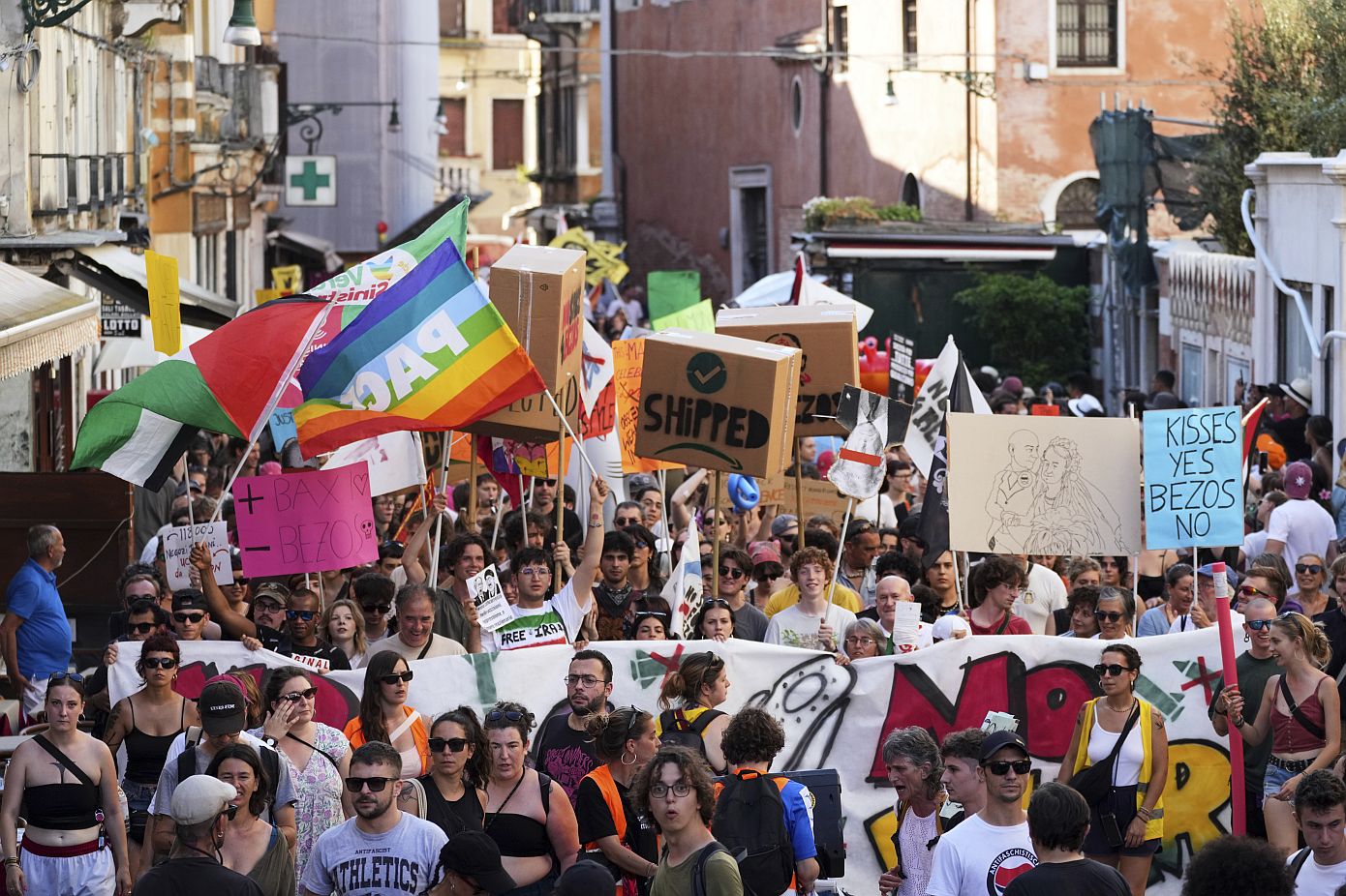 «Μπέζος, μακριά από τη λιμνοθάλασσα», φώναζαν οι διαδηλωτές καθώς έκαναν πορεία στο κέντρο της πόλης. Ορισμένοι κρατούσαν πλακάτ με συνθήματα όπως «Φάτε τους πλούσιους» και «Απορρίπτεται», και άλλα που κατηγορούσαν τον δήμαρχο της Βενετίας για διαφθορά.