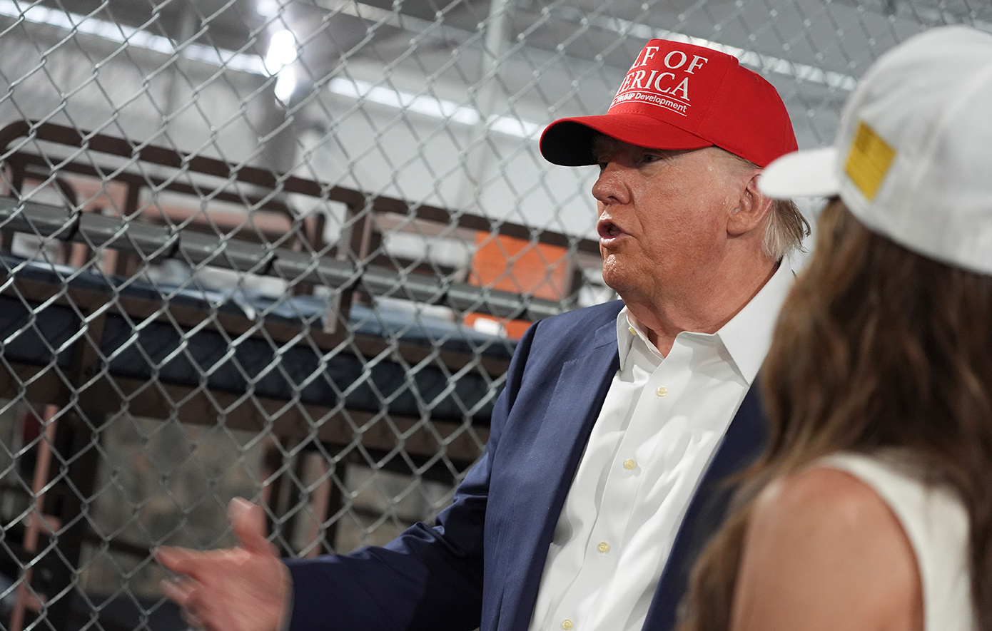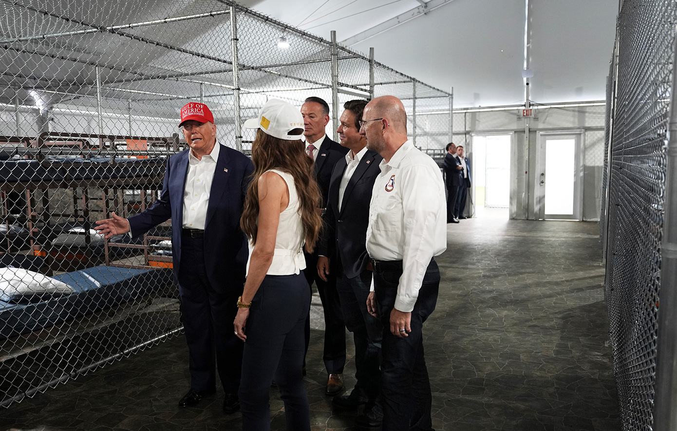 Ο Ντόναλντ Τραμπ κάνοντας προσβλητικά αστεία για τους μετανάστες ξεναγήθηκε στο «Alligator Alcatraz», το κέντρο κράτησης μεταναστών στο Έβεργκλεϊντς της Φλόριντα.