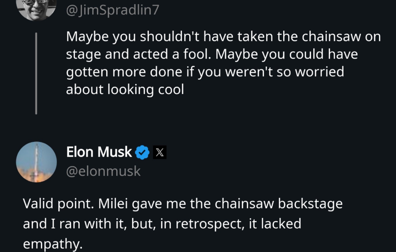 «Ίσως δεν έπρεπε να ανέβεις με αλυσοπρίονο στη σκηνή και να κάνεις τον καραγκιόζη. Ίσως να κατάφερνες περισσότερα, αν δεν σε ένοιαζε τόσο να δείχνεις κουλ», έγραψε ο χρήστης, Τζιμ Σπράντλιν, απαντώντας σε ένα από τα tweet του Μασκ για τις κρατικές δαπάνες.