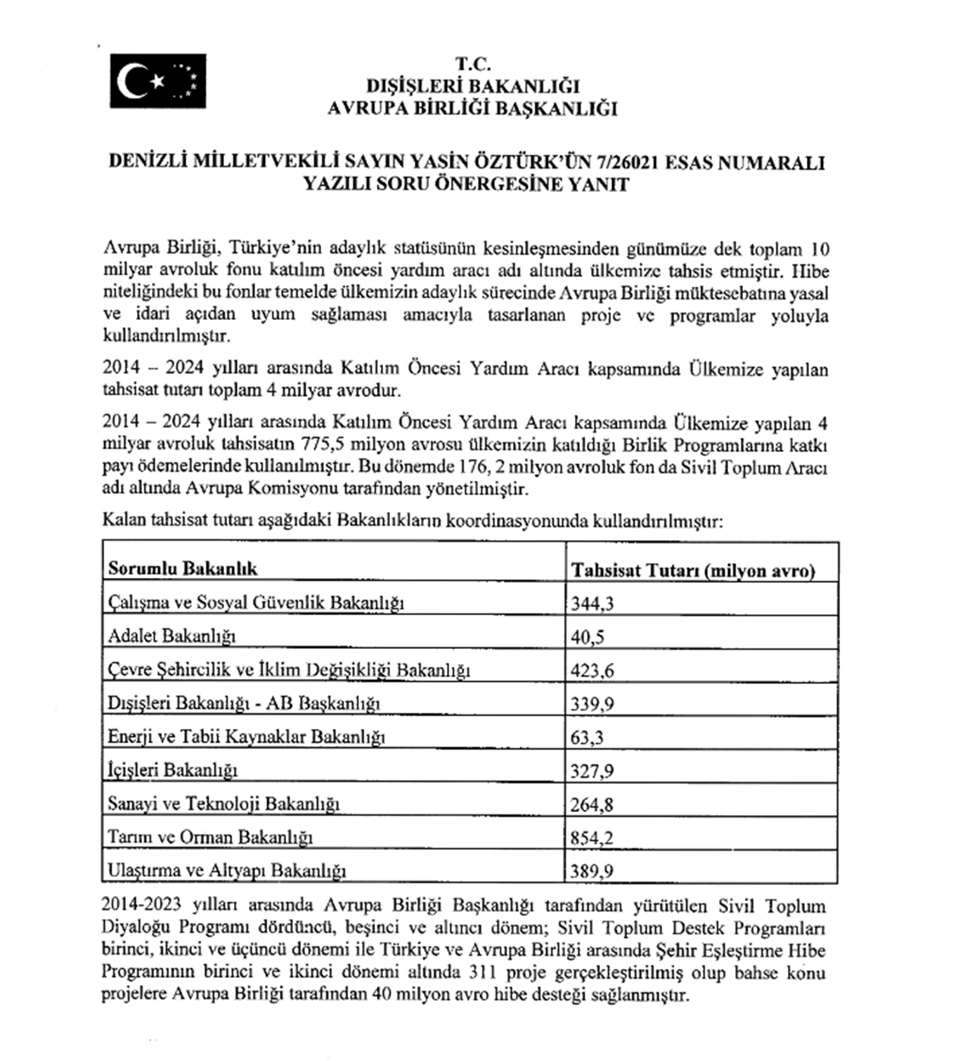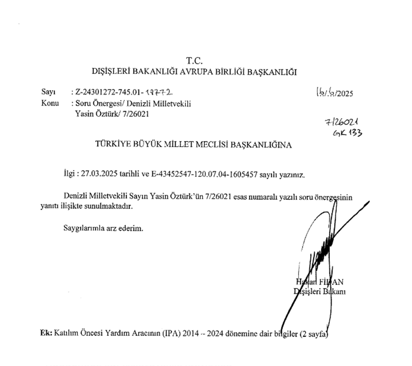Στις 16 Ιουνίου 2025, ο Υπουργός Εξωτερικών της Τουρκίας, Χακάν Φιντάν, αποκάλυψε με επιστολή του προς την τουρκική Εθνοσυνέλευση ότι το υπουργείο του είχε δαπανήσει 339,9 εκατ. ευρώ από ευρωπαϊκά κονδύλια την περίοδο 2014–2024, ενώ το Υπουργείο Εσωτερικών είχε χρησιμοποιήσει 327,9 εκατ. ευρώ κατά την ίδια περίοδο.