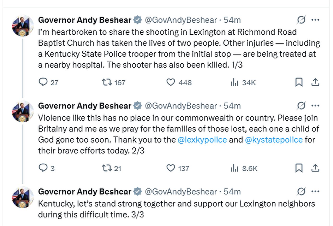 “Παρακαλώ προσευχηθείτε για όλους όσοι επλήγησαν από αυτές τις παράλογες πράξεις βίας”, δήλωσε ο κυβερνήτης Άντι Μπεσίρ.