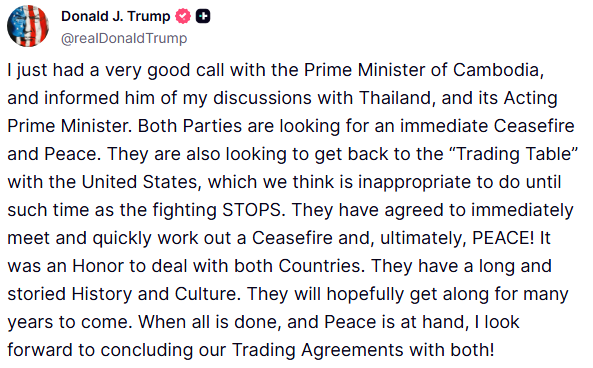 «Μόλις μίλησα με τον πρωθυπουργό της Καμπότζης για να σταματήσουμε τον πόλεμο με την Ταϊλάνδη. Αυτή τη στιγμή τηλεφωνώ στον μεταβατικό πρωθυπουργό της Ταϊλάνδης για να του ζητήσω επίσης κατάπαυση του πυρός και το τέλος του πολέμου που μαίνεται», έγραψε σε ανάρτησή του στον ιστότοπο Truth Social ο Τραμπ.