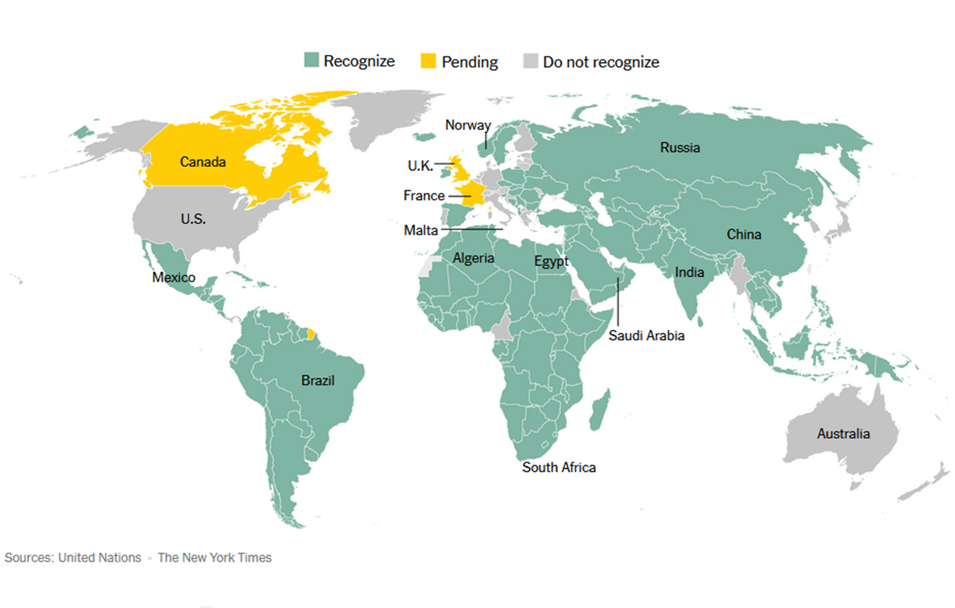 Μεταξύ αυτών είναι η Ρωσία, η Κίνα και η Ινδία, αλλά και ευρωπαϊκά κράτη, όπως η Ισπανία, η Ιρλανδία και η Νορβηγία. Άλλες χώρες που έχουν αναγνωρίσει την Παλαιστίνη ως κράτος είναι οι Αργεντινή, Αρμενία, Βουλγαρία, Κύπρος, Σλοβενία, Σουηδία, Πολωνία, Τουρκία, Ρουμανία, Ουγγαρία.