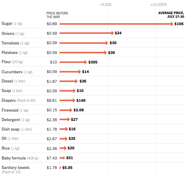 Ένα σαπούνι κοστίζει περίπου 10 δολάρια, σε σύγκριση με 0,59 δολάρια πριν τον πόλεμο. Ένα πακέτο με 40 πάνες κοστίζει 149 δολάρια, σε σύγκριση με 8,61 δολάρια. Το πετρέλαιο ντίζελ κοστίζει 36 δολάρια ανά λίτρο, σε σύγκριση με 1,87 δολάρια, και 400 γραμμάρια γάλακτος για μωρά κοστίζουν 51 δολάρια, σε σύγκριση με 7,43 δολάρια, σύμφωνα με πρόσφατες έρευνες. Σε σύγκριση, στις ΗΠΑ, το πετρέλαιο ντίζελ κοστίζει περίπου 1 δολάριο το λίτρο, και 40 πάνες μπορούν να αγοραστούν για περίπου 5 δολάρια.