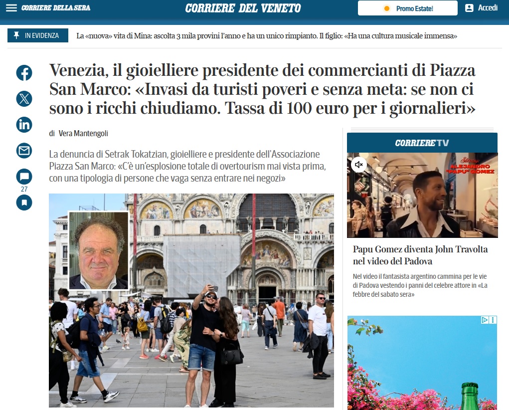 Το ρεπορτάζ της εφημερίδας Corriere del Venetto το οποίο αναδημοσίευσε η Corriere della Sera, αναφέρει στον τίτλο του: «Στη Βενετία οι τουρίστες δεν ψωνίζουν πια».