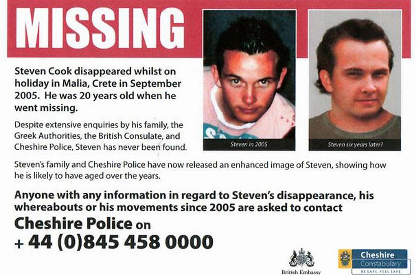 Ο Στίβεν Κουκ είχε ταξιδέψει για πρώτη φορά στο εξωτερικό με φίλους του, επιλέγοντας τα Μάλια της Κρήτης για διακοπές. Τελευταία φορά εθεάθη να ζητά οδηγίες προς το ξενοδοχείο του μετά από νυχτερινή έξοδο. Παρά τις εκτεταμένες έρευνες τότε, δεν εντοπίστηκε κανένα ίχνος του.