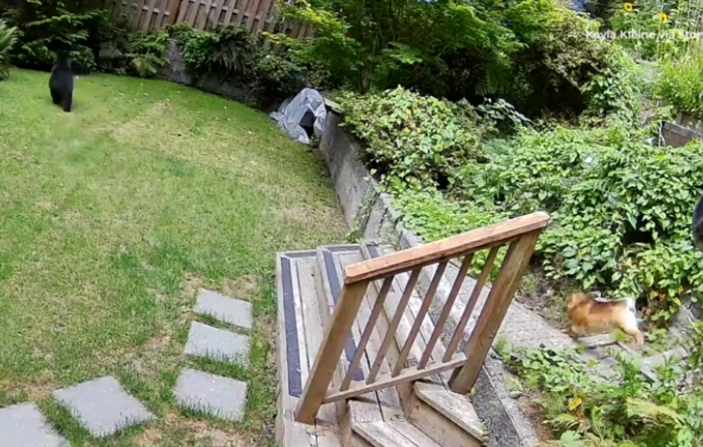 Άλλη κάμερα κατέγραψε τη θεαματική συνέχεια στον κήπο, με την αρκούδα να κατεβαίνει τις σκάλες έντρομη, ενώ ο Σκουτ πηδάει από τα σκαλοπάτια γαβγίζοντας λυσσασμένα.