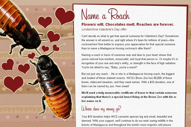 Ο ζωολογικός κήπος του Μπρονξ στη Νέα Υόρκη πρότεινε στους ερωτευμένους ένα εναλλακτικό δώρο για το έτερον ήμισυ με αφορμή την ημέρα των ερωτευμένων. Οι ενδιαφερόμενοι έχουν την ευκαιρία να «βαφτίσουν» μία κατσαρίδα Μαδαγασκάρης με το όνομα του αγαπημένου τους.