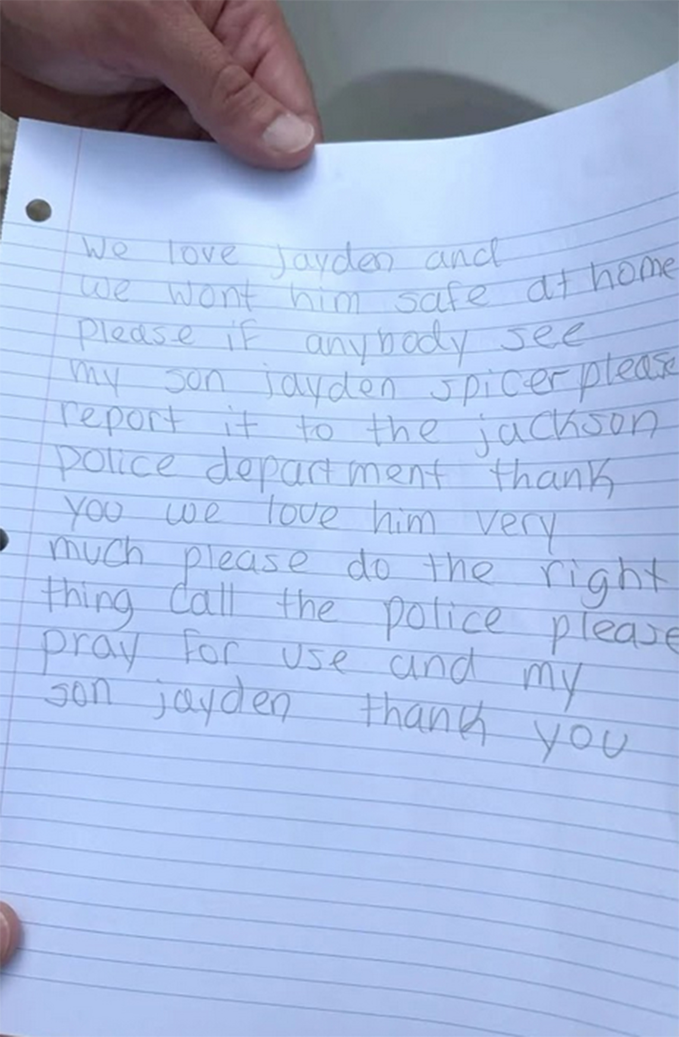 Η τροπή της υπόθεσης είναι συγκλονιστική, καθώς η 33χρονη μητέρα, Felicia Gross, είχε αρχικά απευθύνει δημόσια έκκληση για βοήθεια, μέσω μιας χειρόγραφης δήλωσης στα τοπικά μέσα, παρακαλώντας: «Τον θέλουμε με ασφάλεια σπίτι. Παρακαλώ αν κάποιος δει τον γιο μου Τζέιντεν Σπάισερ, ας το αναφέρει στην αστυνομία. Τον αγαπάμε πολύ, παρακαλώ κάντε το σωστό, καλέστε την αστυνομία, παρακαλώ προσευχηθείτε για εμάς».