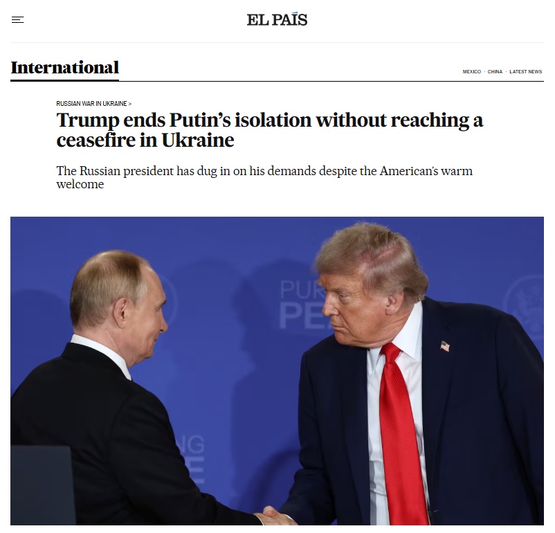 El País: «Ο Τραμπ τερμάτισε την απομόνωση του Πούτιν χωρίς να επιτύχει κατάπαυση του πυρός στην Ουκρανία».