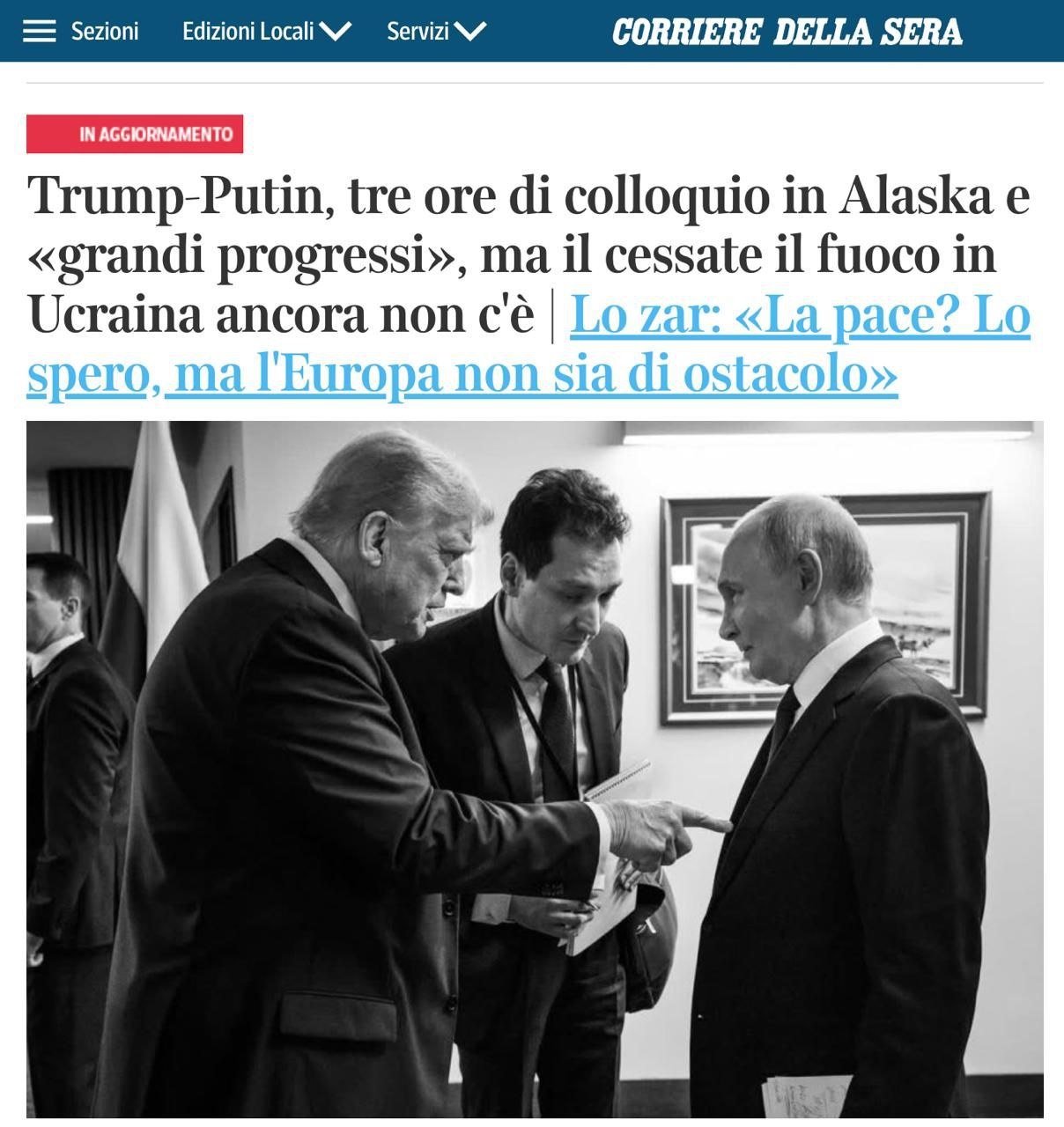 Corriere della sera: «Τραμπ – Πούτιν, τρεις ώρες συνομιλιών, αλλά κατάπαυση του πυρός στην Ουκρανία δεν έρχεται: “Η συμφωνία δεν υπάρχει”. Και ο τσάρος προειδοποιεί την Ευρώπη: “Μην μας εμποδίσετε”.