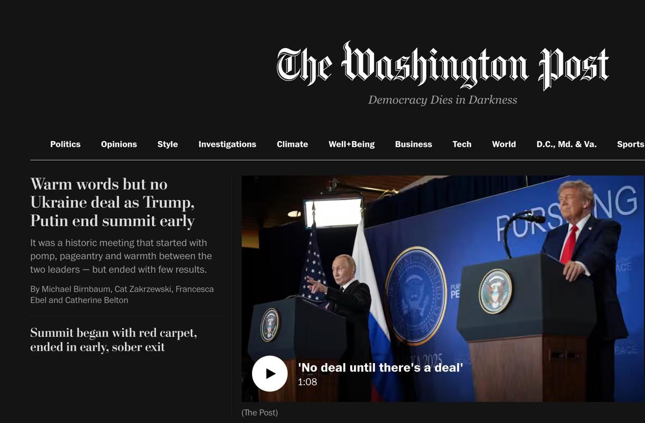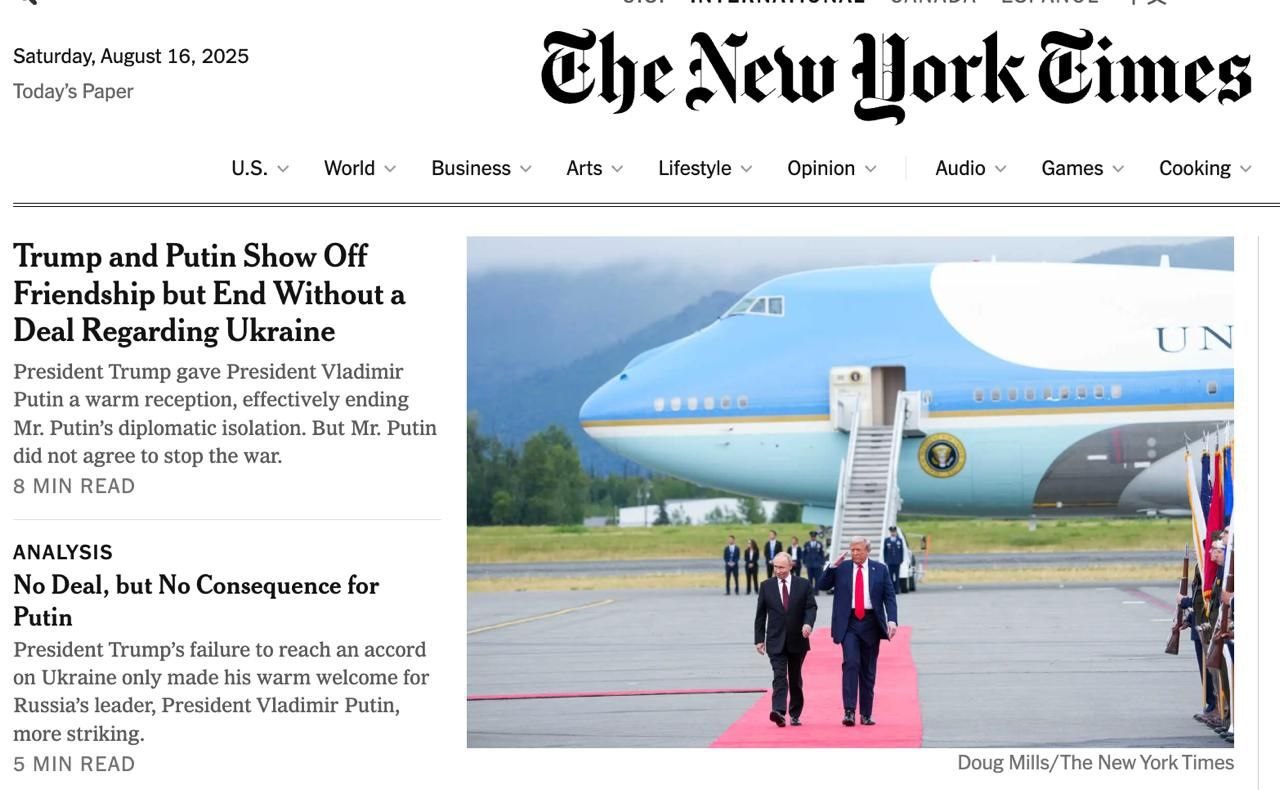 Οι πιο ενδεικτικοί τίτλοι από τα μεγάλα παγκόσμια μέσα ενημέρωσης για τα αποτελέσματα της ιστορικής συνάντησης μεταξύ Πούτιν και Τραμπ στην Αλάσκα: