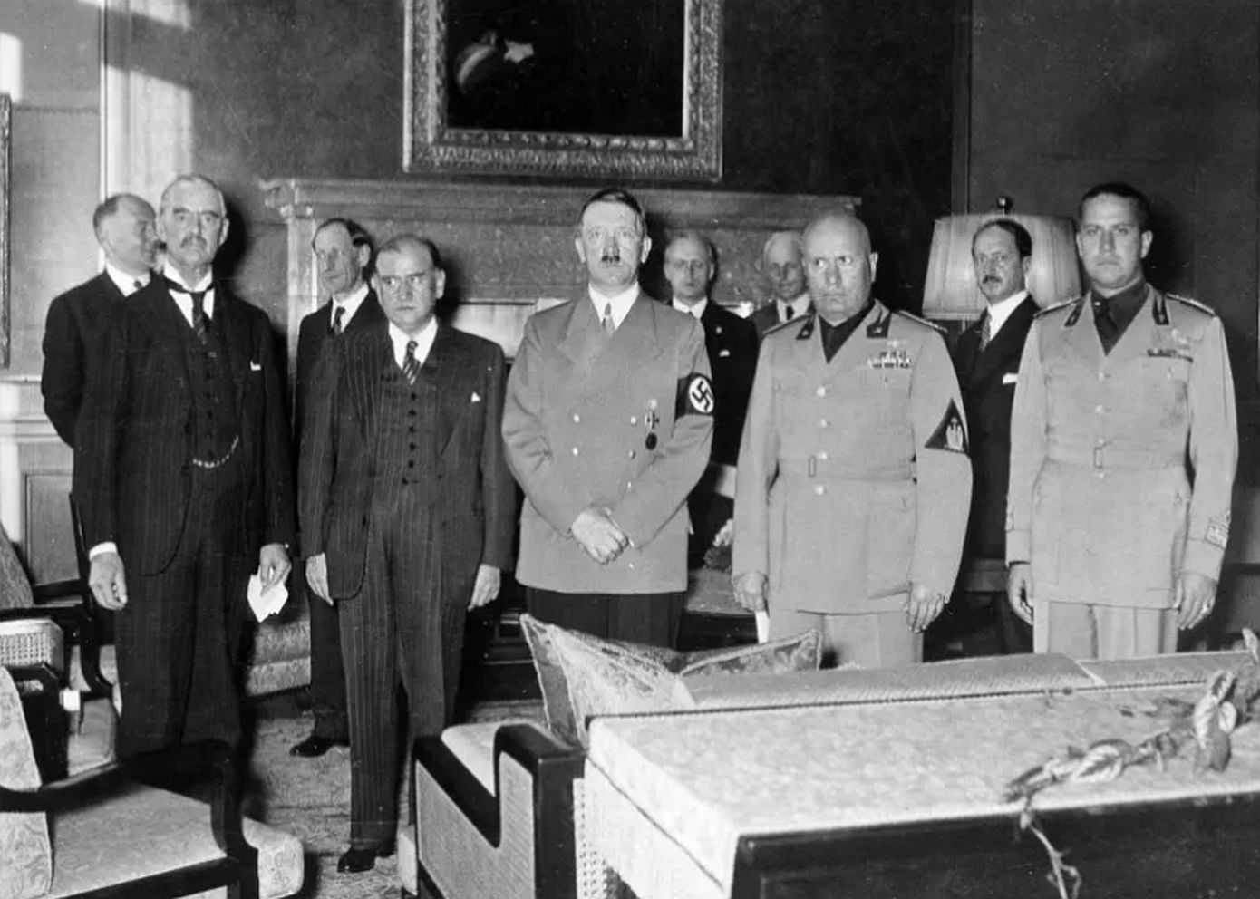 (σ.σ. Στις 29/09/1938 στο Μόναχο η τετραμερής διάσκεψη μεταξύ Γερμανίας (Χίτλερ), Αγγλίας (Τσάμπερλεν), Γαλλίας (Νταλαντιέ), Ιταλίας (Μουσολίνι), αποφάσισε να παραδώσει η Τσεχοσλοβακία την περιοχή της Σουδητίας στη Γερμανία).