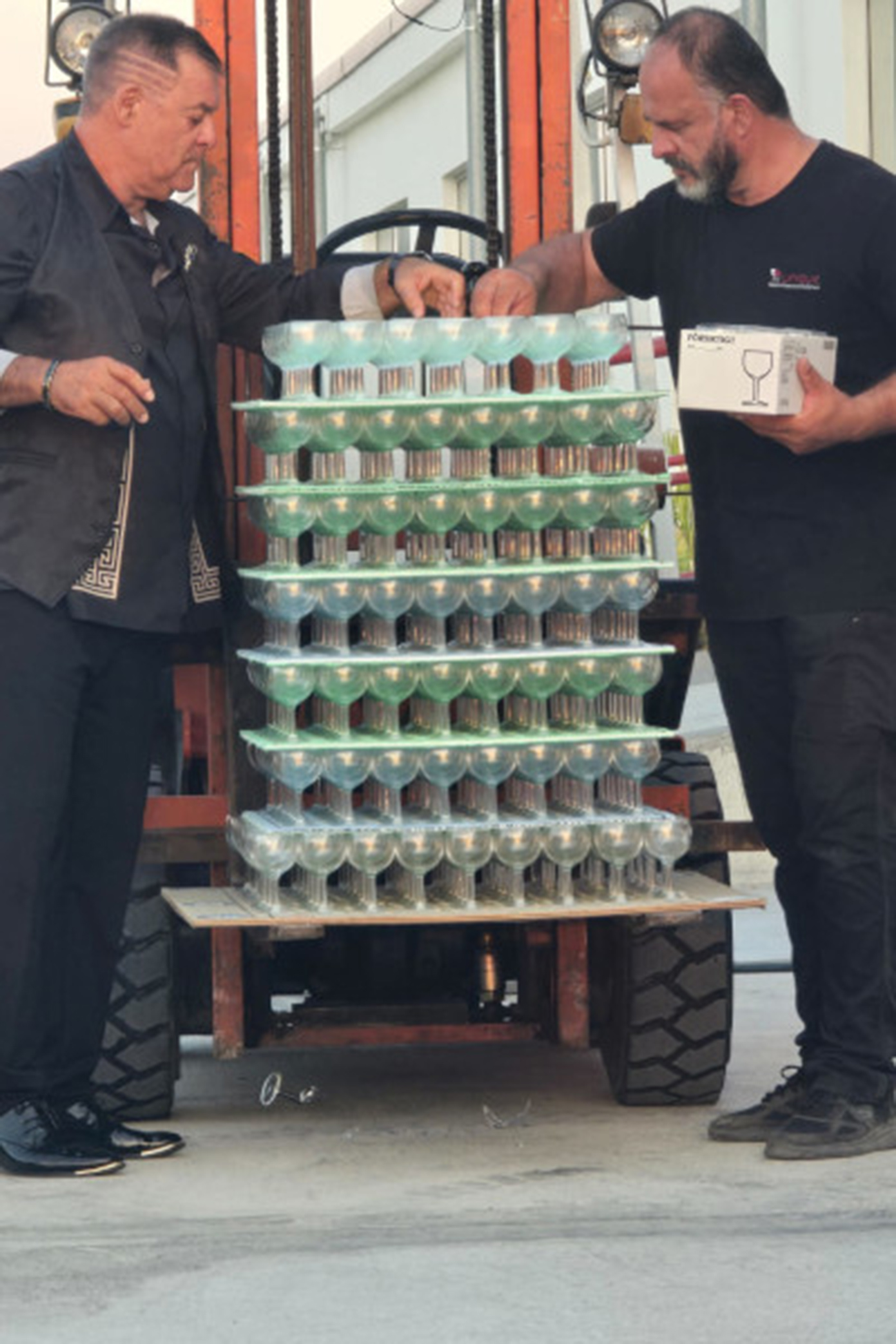 Για να το πετύχει, επιστρατεύτηκε μια ολόκληρη ομάδα από φίλους και συγγενείς. Αντί να τοποθετούν τα ποτήρια ένα-ένα, τα οργάνωσαν σε ένα συμπαγές μπλοκ, το οποίο ανασηκώθηκε προσεκτικά με τη βοήθεια ενός κλαρκ.