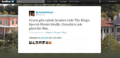 Σε χοντρή γκάφα, και μάλιστα μέσω Twitter, υπέπεσε o Αμπντουλάχ Γκιουλ. O πρόεδρος της Τουρκίας θέλησε να μοιραστεί με τους 185.000 followers τον ενθουσιασμό του για την ταινία «Ο Λόγος του Βασιλιά». Δήλωσε ότι το είδε το Σαββατοκύριακο μαζί με τη σύζυγό του και ότι του άρεσε πολύ.