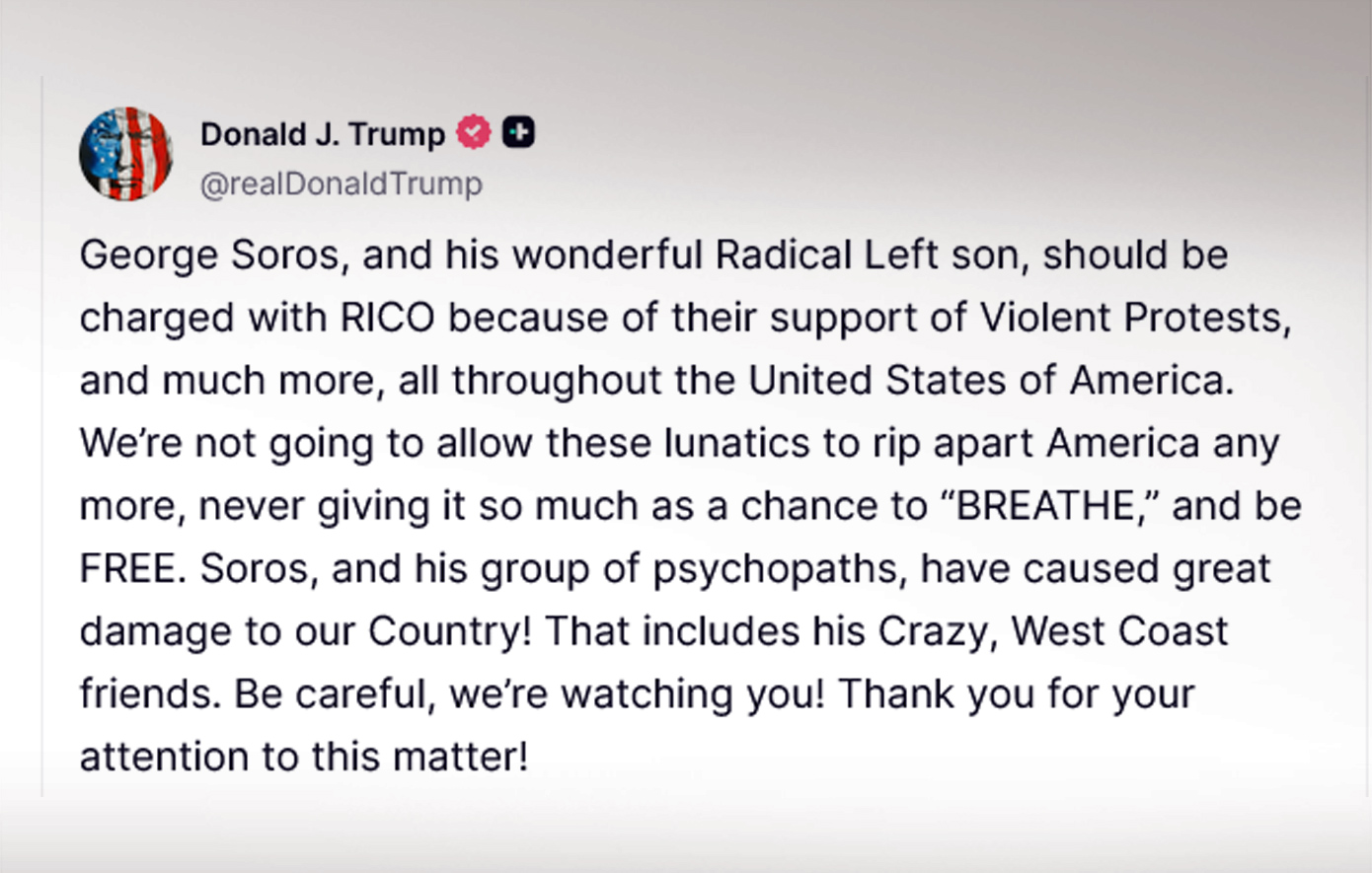 «Δεν πρόκειται να επιτρέψουμε σε αυτούς τους τρελούς να διαλύσουν άλλο την Αμερική, χωρίς ποτέ να της δώσουν ούτε μια ευκαιρία να “ΑΝΑΠΝΕΥΣΕΙ” και να είναι “ΕΛΕΥΘΕΡΗ”. Ο Σόρος, και η ομάδα των ψυχοπαθών του, έχουν προκαλέσει μεγάλη ζημιά στη χώρα μας! Αυτό περιλαμβάνει και τους τρελούς φίλους του στη Δυτική Ακτή. Προσέξτε, σας παρακολουθούμε!», έγραφε η ανάρτηση του Αμερικανού προέδρου.