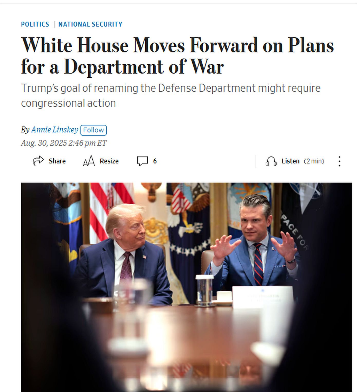 Η αμερικανική κυβέρνηση του προέδρου Ντόναλντ Τραμπ προωθεί σχέδια για την μετονομασία του υπουργείου Άμυνας σε υπουργείο Πολέμου, ανέφερε σήμερα η Wall Street Journal, επικαλούμενη αξιωματούχο του Λευκού Οίκου.