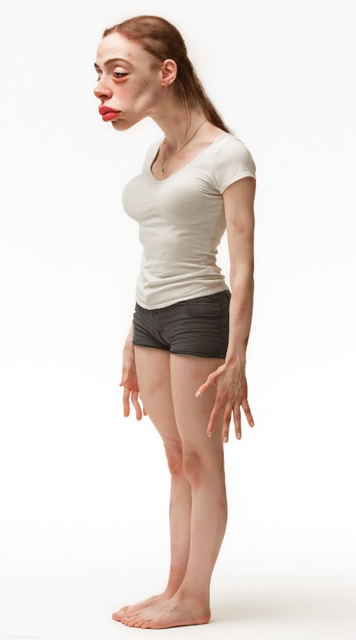 Η Ava έχει άνισο και παραμορφωμένο πρόσωπο από τη χρόνια χρήση fillers. Το υπερβολικό botox και οι ενέσεις δημιουργούν φουσκωμένα μάγουλα, μυτερό «σαγόνι μάγισσας» και αφύσικη υφή στο πρόσωπο.
