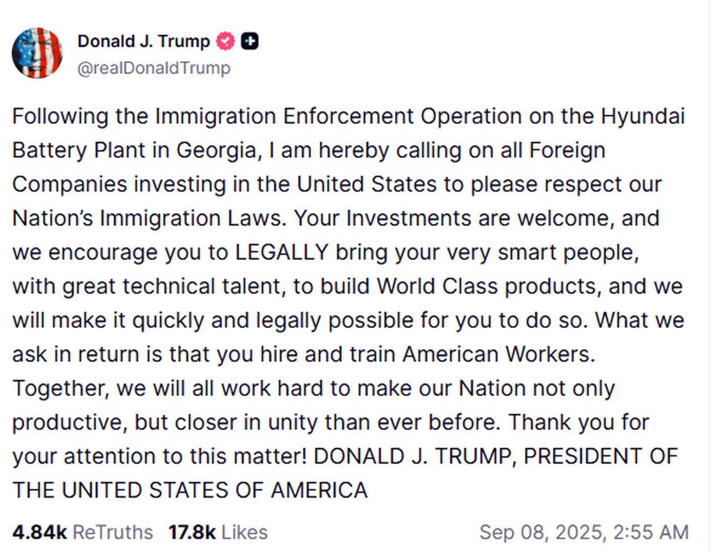 Ο Ντόναλντ Τραμπ απαίτησε χθες Κυριακή οι ξένες εταιρείες να τηρούν τους νόμους των ΗΠΑ για τη μετανάστευση, μετά τη σύλληψη 300 και πλέον Νοτιοκορεατών εργαζομένων την Παρασκευή σε υπό κατασκευή εργοστάσιο των Hyundai και LG στην Τζόρτζια (νοτιοανατολικά).