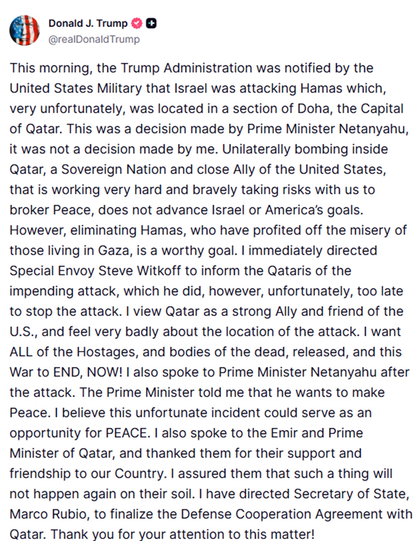 Νωρίτερα μέσα στην ημέρα, σε ανάρτησή του στα μέσα κοινωνικής δικτύωσης, προσπάθησε να αποστασιοποιηθεί από την ισραηλινή επίθεση, ταυτόχρονα επικρίνοντας και επαινώντας τον Νετανιάχου. «Αυτή ήταν μια απόφαση του πρωθυπουργού Νετανιάχου, δεν ήταν δική μου απόφαση», έγραψε ο Τραμπ, επισημαίνοντας ότι «η μονομερής βομβιστική επίθεση στο Κατάρ, ένα κυρίαρχο κράτος και στενό σύμμαχο των Ηνωμένων Πολιτειών, που εργάζεται σκληρά και με θάρρος παίρνει ρίσκα μαζί μας για να μεσολαβήσει για την ειρήνη, δεν προωθεί τους στόχους του Ισραήλ ή της Αμερικής». Παράλληλα όμως πρόσθεσε: «Η εξάλειψη της Χαμάς, που έχει κερδοσκοπήσει από τη δυστυχία όσων ζουν στη Γάζα, είναι ένας αξιόλογος στόχος».