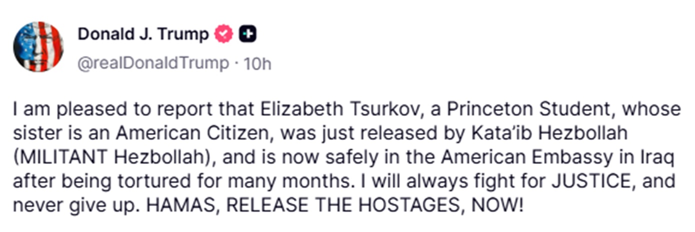 Ο Τραμπ έχει επικεντρωθεί κυρίως στην απελευθέρωση των ομήρων που κρατά η Χαμάς. «Θέλω ΟΛΟΙ οι όμηροι, και τα σώματα των νεκρών, να απελευθερωθούν, και αυτός ο πόλεμος να ΤΕΡΜΑΤΙΣΤΕΙ, ΤΩΡΑ!», έγραψε σε ανάρτησή του την Τρίτη. Ωστόσο, σε μια σπάνια διαφοροποίηση από τον Νετανιάχου, ο Τραμπ αναγνώρισε τον Ιούλιο ότι οι Παλαιστίνιοι λιμοκτονούν, τη στιγμή που ο Ισραηλινός πρωθυπουργός αμφισβητούσε τα σχετικά στοιχεία, καθώς το Ισραήλ δεχόταν διεθνή κατακραυγή για τον αποκλεισμό τροφίμων και την πρόκληση λιμού στη Γάζα.