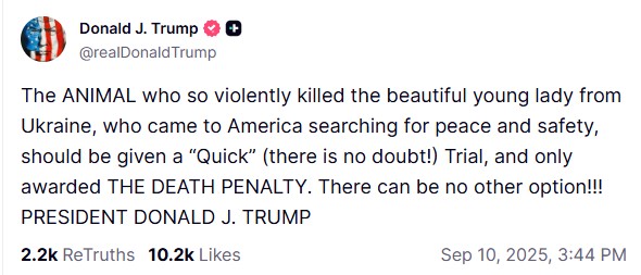«Το ΚΤΗΝΟΣ που σκότωσε τόσο βίαια τη νεαρή όμορφη γυναίκα από την Ουκρανία, η οποία ήρθε στην Αμερική αναζητώντας ειρήνη και ασφάλεια, πρέπει να δικαστεί “άμεσα” (δεν υπάρχει καμία αμφιβολία!) και να καταδικαστεί ΜΟΝΟ στη ΘΑΝΑΤΙΚΗ ΠΟΙΝΗ. Δεν μπορεί να υπάρξει άλλη επιλογή!!!