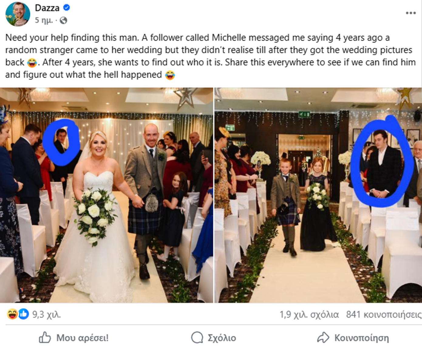Η Μισέλ Γουάιλι πάντα αναρωτιόταν ποιος ήταν ο «τυχαίος μελαχρινός άγνωστος» που εμφανιζόταν σε φωτογραφίες από τη μεγάλη ημέρα της και κανείς δεν μπορούσε να τον αναγνωρίσει. Ο άνδρας φαινόταν να στέκεται στον διάδρομο και στο πίσω μέρος της ομαδικής φωτογραφίας του γάμου της Μισέλ και του συζύγου της, Τζον. Οι προηγούμενες προσπάθειες να ταυτοποιηθεί παρέμεναν ανεπιτυχείς, αλλά μια πρόσφατη ανάρτηση στο Facebook αποκάλυψε την αληθινή και αστεία ιστορία πίσω από τον «εισβολέα γάμου».
