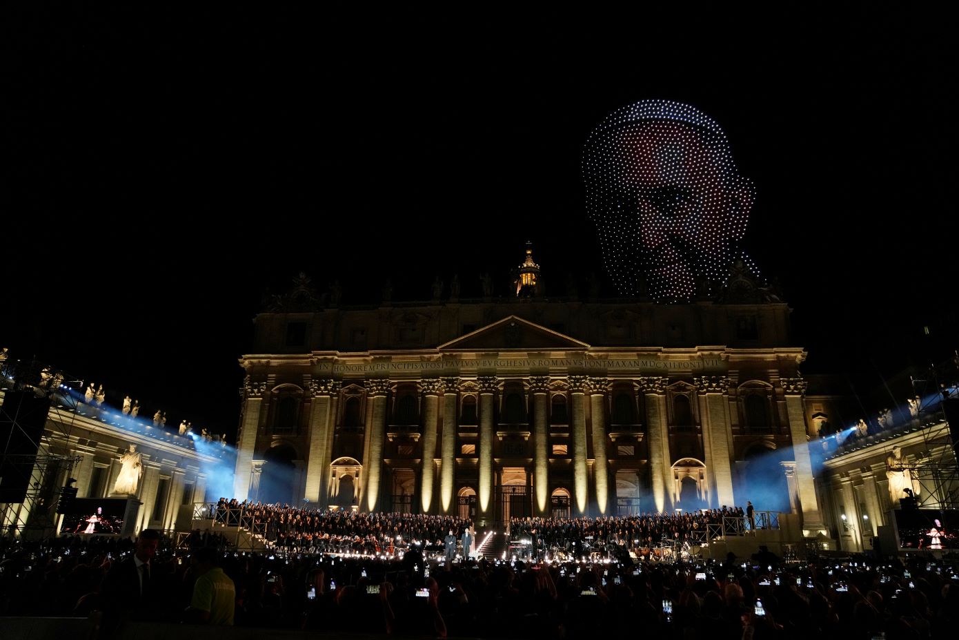 Η Nova Sky Stories του Κίμπαλ Μασκ, με την άδεια της Αγίας Έδρας, οργάνωσε το μεγαλύτερο σόου drones που έχει γίνει ποτέ στην Ευρώπη, σπάζοντας μια πολυετή παράδοση απαγόρευσης φωτεινών προβολών στην πλατεία. Η βραδιά συνδυάστηκε με την πρώτη συναυλία που φιλοξενήθηκε ποτέ στον χώρο, με τον Φαρέλ Γουίλιαμς και τον Αντρέα Μποτσέλι να ηγούνται της καλλιτεχνικής εμπειρίας.