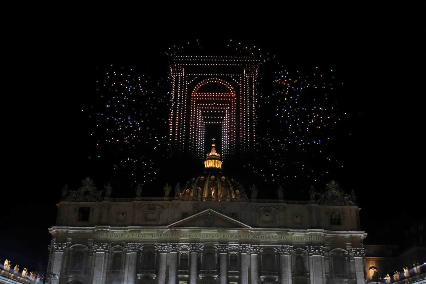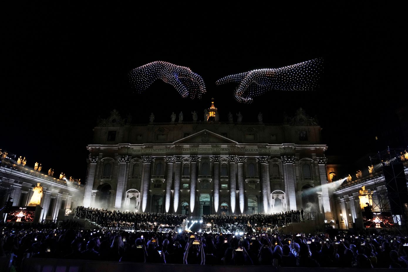 Πάνω από 3.000 drones σχεδίασαν στον ουρανό εικόνες: από το εμβληματικό άγγιγμα του Θεού και του Αδάμ έως την «Πιετά» και ένα φωτεινό πορτρέτο του Πάπα Φραγκίσκου.