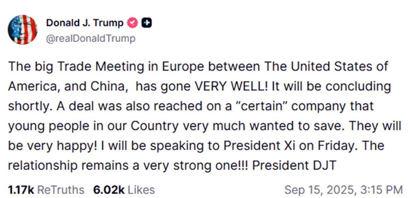 «Η μεγάλη συνάντηση για το εμπόριο στην Ευρώπη μεταξύ των Ηνωμένων Πολιτειών Αμερικής και της Κίνας πήγε ΠΟΛΥ ΚΑΛΑ! (σ.σ. Οι συνομιλίες) θα ολοκληρωθούν σύντομα», έγραψε ο Τραμπ στο δίκτυό του Truth Social.