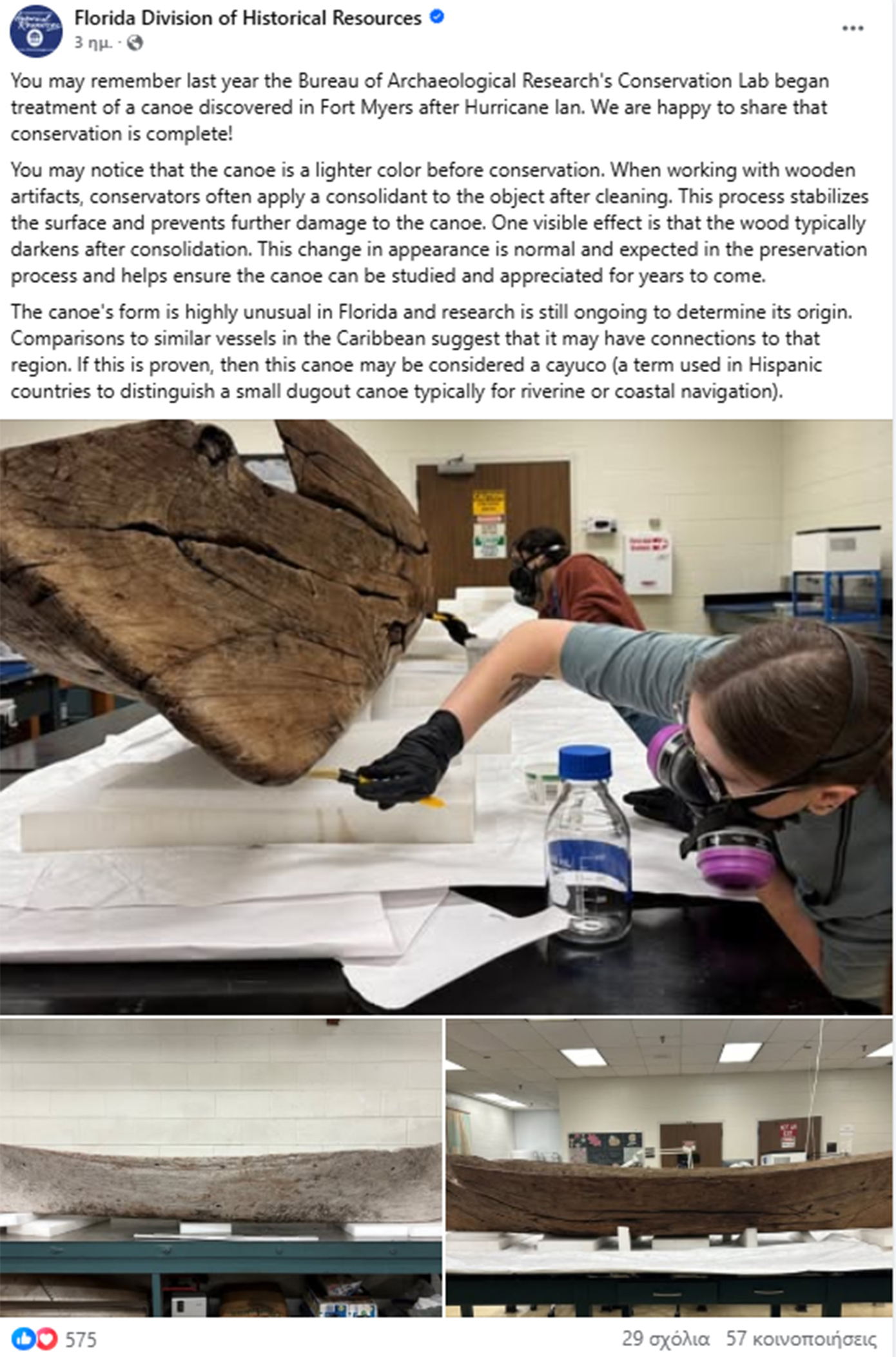 Το ξύλινο σκάφος, μήκους περίπου 2,7 μέτρων, βρέθηκε στις ακτές του Φορτ Μάγιερς αμέσως μετά το πέρασμα του τυφώνα, όταν τα νερά ανέβηκαν ακόμη και 4,5 μέτρα πάνω από το έδαφος. Από την πρώτη στιγμή μεταφέρθηκε στα εργαστήρια της Διεύθυνσης Ιστορικών Πόρων της Φλόριντα, όπου συντηρητές εργάστηκαν για να το σταθεροποιήσουν, καθώς τα ευρήματα αυτού του τύπου είναι εξαιρετικά εύθραυστα και κινδυνεύουν να διαλυθούν όταν έρχονται σε επαφή με τον αέρα, όπως αναφέρει το δημοσίευμα της nypost.