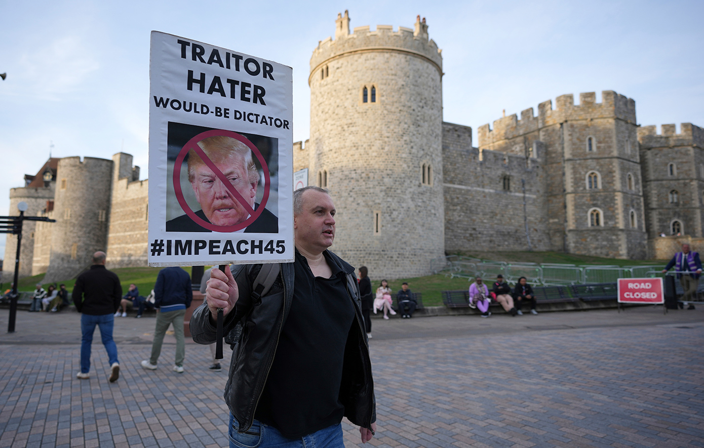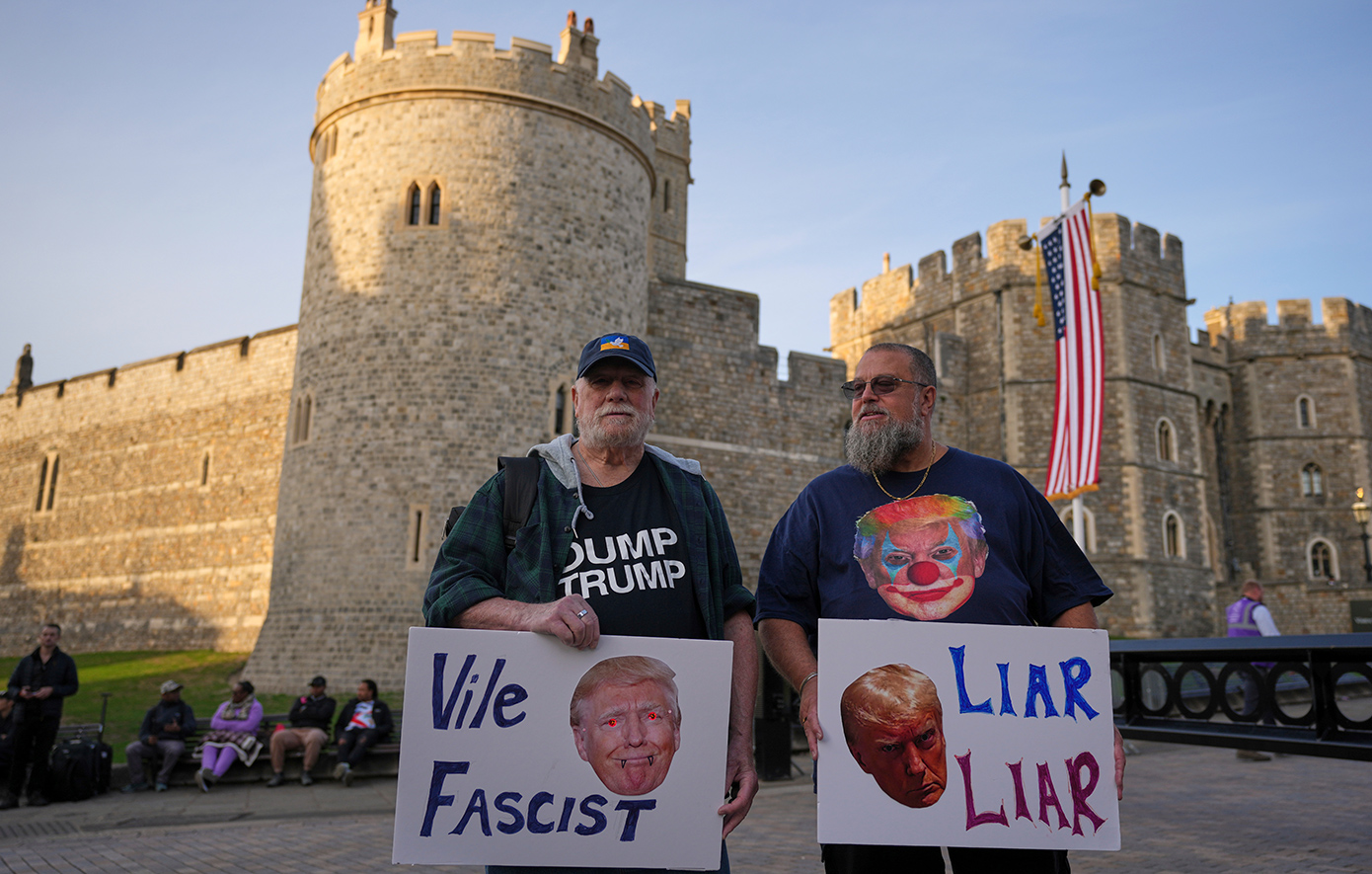 Νωρίτερα την Τρίτη, όμως, διαδηλωτές άνοιξαν ένα τεράστιο πανό με μια φωτογραφία του Τραμπ και του Έπσταϊν κοντά στο Κάστρο του Ουίνδσορ και αργότερα πρόβαλαν αρκετές εικόνες των δύο σε έναν από τους πύργους του κάστρου.