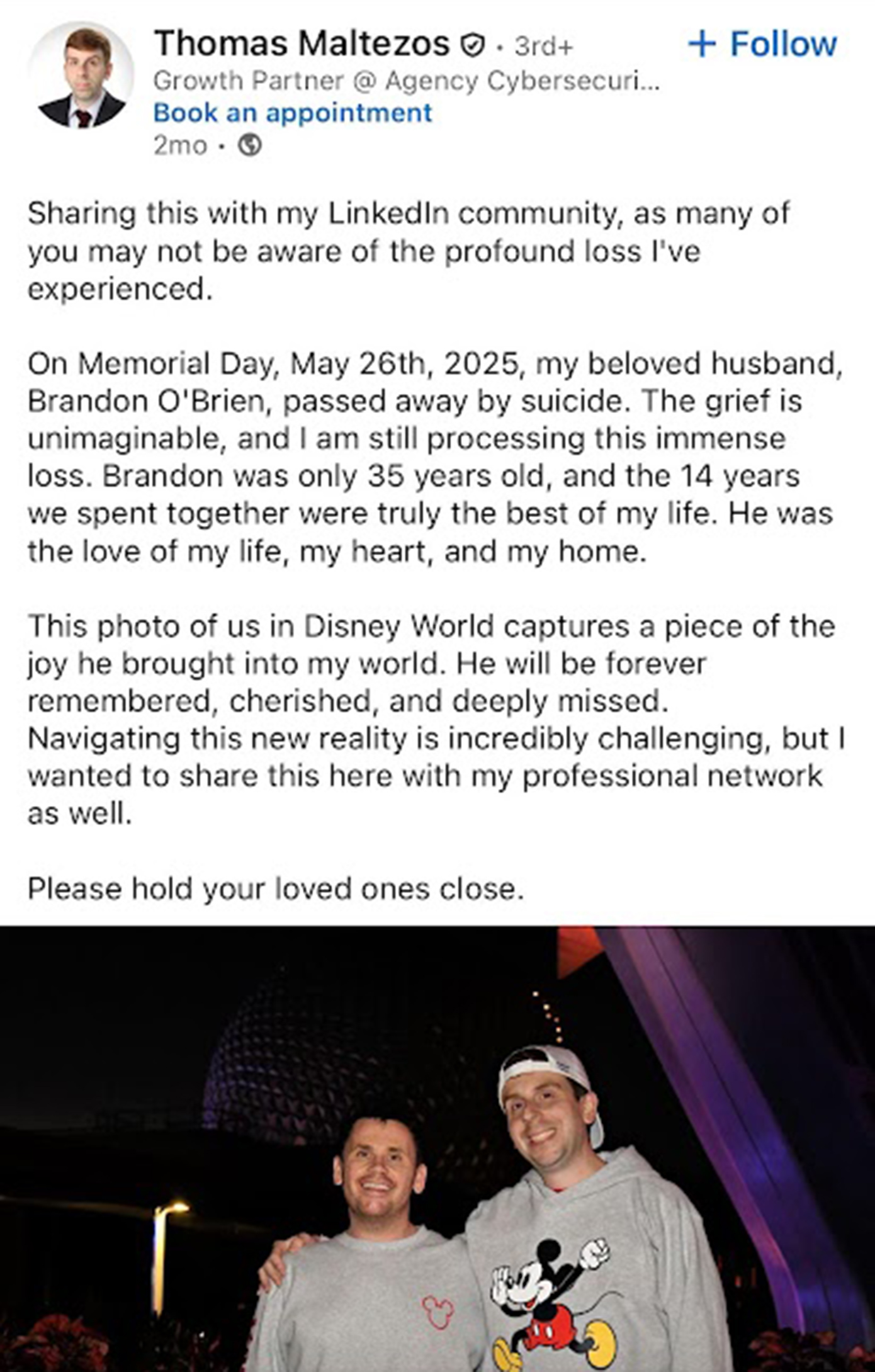 «Αυτή η φωτογραφία μας στην Disney αποτυπώνει ένα κομμάτι της χαράς που έφερε στη ζωή μου. Θα τον θυμόμαστε για πάντα, θα τον αγαπάμε και θα μας λείπει πολύ. Η προσαρμογή σε αυτή τη νέα πραγματικότητα είναι εξαιρετικά δύσκολη, αλλά ήθελα να το μοιραστώ και με το επαγγελματικό μου δίκτυο. Παρακαλώ, κρατήστε τους αγαπημένους σας κοντά σας», συμπλήρωσε.