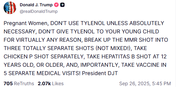 «Έγκυες γυναίκες, ΜΗΝ ΧΡΗΣΙΜΟΠΟΙΕΙΤΕ TYLENOL ΕΚΤΟΣ ΕΑΝ ΕΙΝΑΙ ΑΠΟΛΥΤΩΣ ΑΝΑΓΚΑΙΟ, ΜΗΝ ΔΙΝΕΤΕ TYLENOL ΣΤΟ ΜΙΚΡΟ ΠΑΙΔΙ ΣΑΣ ΓΙΑ ΣΧΕΔΟΝ ΚΑΝΕΝΑ ΛΟΓΟ, ΧΩΡΙΣΤΕ ΤΟ ΕΜΒΟΛΙΟ MMR ΣΕ ΤΡΕΙΣ ΕΝΤΕΛΩΣ ΞΕΧΩΡΙΣΤΕΣ ΔΟΣΕΙΣ (ΟΧΙ ΣΕ ΜΙΓΜΑ!), ΚΑΝΤΕ ΤΟ ΕΜΒΟΛΙΟ ΤΗΣ ΑΝΕΜΟΒΛΟΓΙΑΣ ΞΕΧΩΡΙΣΤΑ, ΤΟ ΕΜΒΟΛΙΟ ΤΗΣ ΗΠΑΤΙΤΙΔΑΣ Β ΣΤΑ 12 ΧΡΟΝΙΑ Ή ΑΡΓΟΤΕΡΑ, ΚΑΙ, ΣΗΜΑΝΤΙΚΟ, ΝΑ ΓΙΝΕΤΑΙ Ο ΕΜΒΟΛΙΑΣΜΟΣ ΣΕ 5 ΞΕΧΩΡΙΣΤΕΣ ΙΑΤΡΙΚΕΣ ΕΠΙΣΚΕΨΕΙΣ! Πρόεδρος Ντόναλντ Τραμπ», έγραψε ο Αμερικανός πρόεδρος.