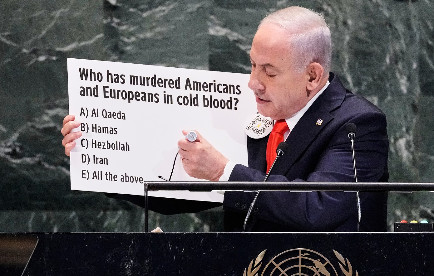 Με αρκετά props (βοηθητικά αντικείμενα), όπως συνηθίζει, ανέβηκε στο βήμα της Γενικής Συνέλευσης του ΟΗΕ ο Ισραηλινός πρωθυπουργός Μπενιαμίν Νετανιάχου.