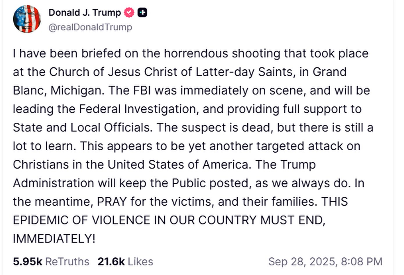 «Φαίνεται ότι πρόκειται για άλλη μια στοχευμένη επίθεση εναντίον Χριστιανών στις ΗΠΑ», δήλωσε ο πρόεδρος Τραμπ σε ανάρτησή του στην πλατφόρμα Truth Social. «Αυτή η επιδημία βίας στη χώρα μας πρέπει να σταματήσει αμέσως», τόνισε, λιγότερο από τρεις εβδομάδες μετά τη δολοφονία του υπερσυντηρητικού ακτιβιστή Τσάρλι Κερκ σε πανεπιστήμιο της Γιούτα.