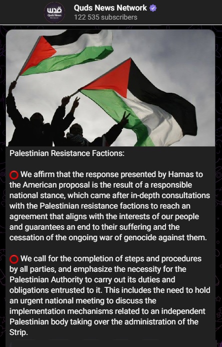 Επιβεβαιώνουμε ότι η απάντηση που παρουσίασε η Χαμάς στην αμερικανική πρόταση αποτελεί αποτέλεσμα υπεύθυνης εθνικής στάσης, η οποία προέκυψε ύστερα από σε βάθος διαβουλεύσεις με τις παλαιστινιακές αντιστασιακές οργανώσεις, με στόχο την επίτευξη συμφωνίας που να ανταποκρίνεται στα συμφέροντα του λαού μας και να εγγυάται τον τερματισμό των δεινών του και της συνεχιζόμενης γενοκτονικής επίθεσης εναντίον του.