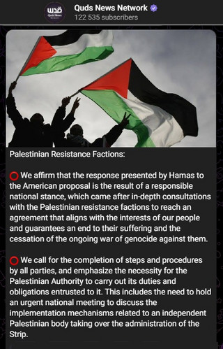 Οι παλαιστινιακές αντιστασιακές οργανώσεις τονίζουν ότι η απάντηση που παρουσίασε η Χαμάς στην αμερικανική πρόταση «αποτελεί αποτέλεσμα υπεύθυνης εθνικής στάσης», η οποία προέκυψε ύστερα από σε βάθος μεταξύ τους διαβουλεύσεις.