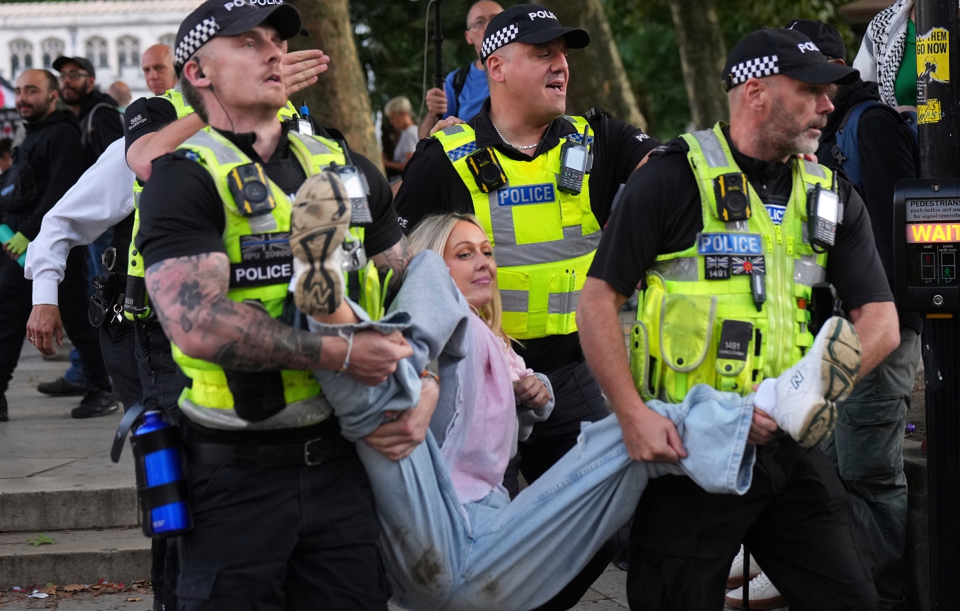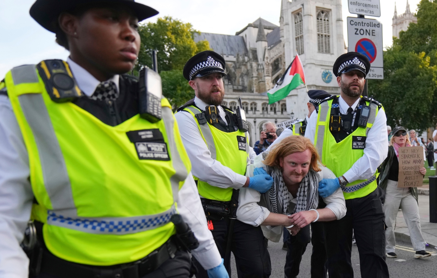 Αστυνομικοί συνέλαβαν διαδηλωτές στην πλατεία Τραφάλγκαρ οι οποίοι έγραφαν συνθήματα σε πανό δηλώνοντας την υποστήριξή τους στην Palestine Action, η οποία απαγορεύθηκε τον Ιούλιο αφού μέλη της διείσδυσαν σε αεροπορική βάση και προκάλεσαν ζημιές σε στρατιωτικά αεροπλάνα.