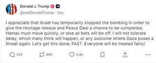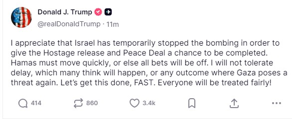 «Εκτιμώ ότι το Ισραήλ έχει προσωρινά σταματήσει τους βομβαρδισμούς για να δώσει την ευκαιρία στην απελευθέρωση των ομήρων και στην ολοκλήρωση της συμφωνίας ειρήνης», έγραψε.