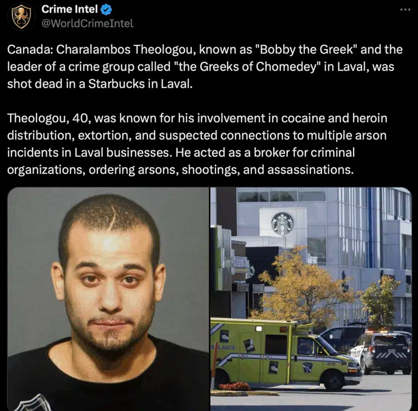 «Στόχος ήταν κάποιος με το όνομα Χαράλαμπος Θεολόγου ή αλλιώς «Bobby ο Έλληνας». Σκοτώθηκε δίπλα σε άλλα δυο μέλη της συμμορίας. Το Ράδιο Καναδάς αναφέρει πως αυτή η συμμορία είναι γνωστή ως «οι Έλληνες του Σόμεντεϊ»… είναι μια περιοχή στο Λαβάλ. Είναι γνωστοί για εκβιασμούς. Ο Μπόμπι ο Έλληνας, ο άντρας που δολοφονήθηκε εδώ σήμερα το πρωί, ήταν ο αρχηγός αυτής της συμμορίας. Οι άλλοι δυο τραυματίστηκαν σοβαρά», μεταδίδει το CBC.