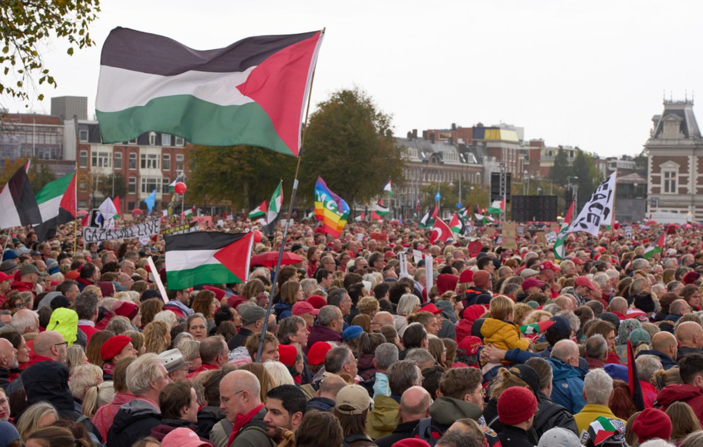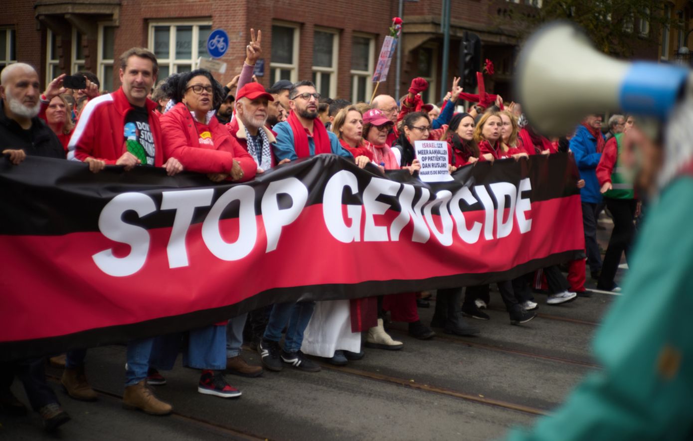 Δεκάδες χιλιάδες άνθρωποι κατέβηκαν σήμερα στους δρόμους του Άμστερνταμ, ντυμένοι στα κόκκινα, για να ζητήσουν τον τερματισμό του πολέμου στη Γάζα, την «Ελευθερία στην Παλαιστίνη» και «Να σταματήσει η γενοκτονία», όπως ήταν και κάποια από τα συνθήματά τους.
