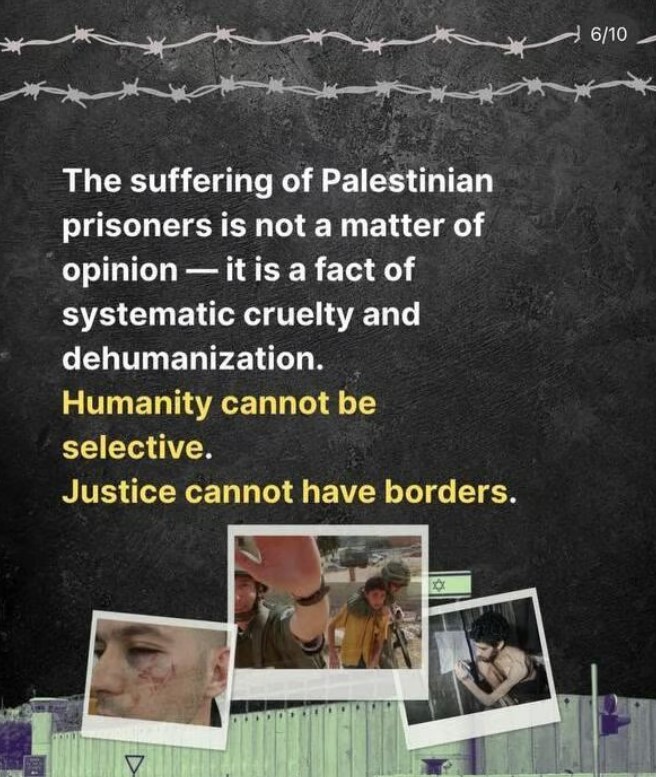 «Τα δεινά των Παλαιστινίων κρατουμένων δεν είναι θέμα άποψης, είναι γεγονός σκληρότητας και απανθρωπιάς. Η ανθρωπιά δεν μπορεί να είναι επιλεκτική. Η δικαιοσύνη δεν μπορεί να έχει σύνορα», ανέφερε η ανάρτηση.