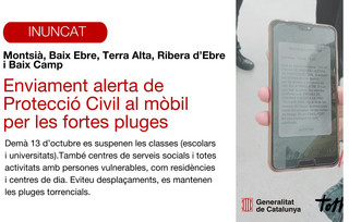 Η Πολιτική Προστασία της Καταλονίας ενεργοποίησε το σύστημα ειδοποιήσεων “Es Alert“, στέλνοντας προειδοποιητικά μηνύματα σε χιλιάδες πολίτες, με βασική σύσταση να αποφύγουν τις μετακινήσεις και να παραμείνουν σε ασφαλές σημείο. Η προειδοποίηση καλύπτει πλέον ολόκληρες περιοχές από το Αλκανάρ έως το Σαλού, με έμφαση σε οικισμούς κοντά σε ποτάμια και ρέματα, όπου υπάρχει υψηλός κίνδυνος ξαφνικής πλημμύρας.