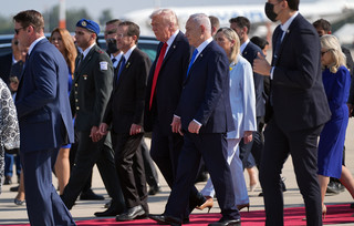 Τον πρόεδρο των ΗΠΑ υποδέχτηκαν ο πρόεδρος του Ισραήλ, Ισαάκ Χέρτζογκ, μαζί με τον πρωθυπουργό της χώρας, Μπενιαμίν Νετανιάχου και τη σύζυγό του, Σάρα. Οι τρεις τους, μάλιστα, συζήτησαν για αρκετά λεπτά.